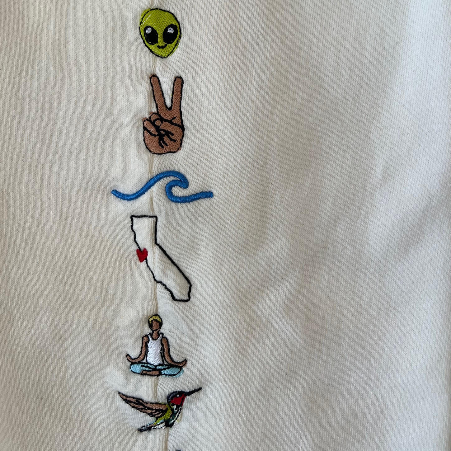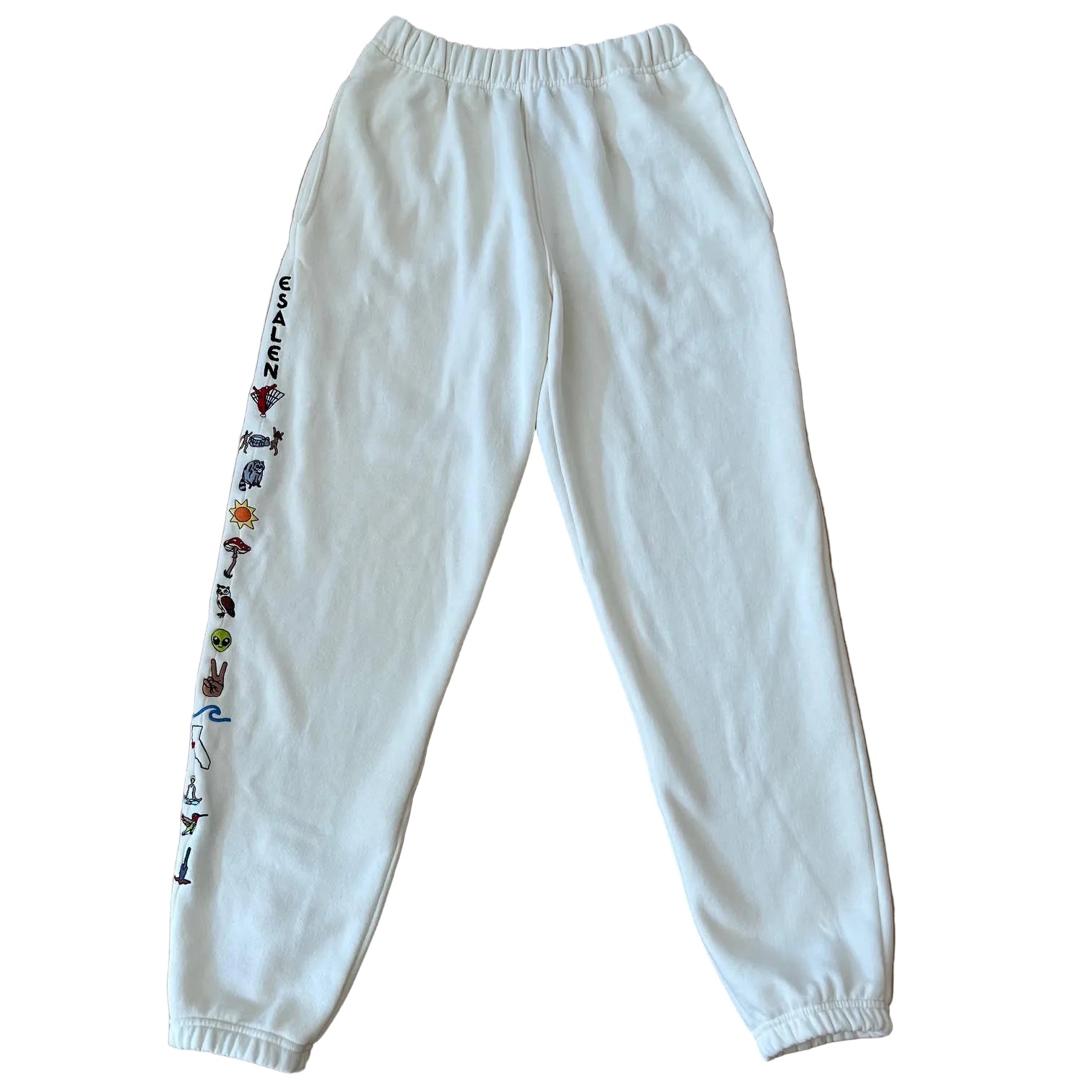 Featured here in a beautiful cream color is the Esalen Embroidered Track Jogger Pant. Uniquely designed to showcase different spaces, animals and activities at Esalen, this pant has two lined pockets and a hidden drawstring waist. Made from 100% cotton, this piece is embroidered and designed in Malibu, California. Please note that natural variation is intentional.