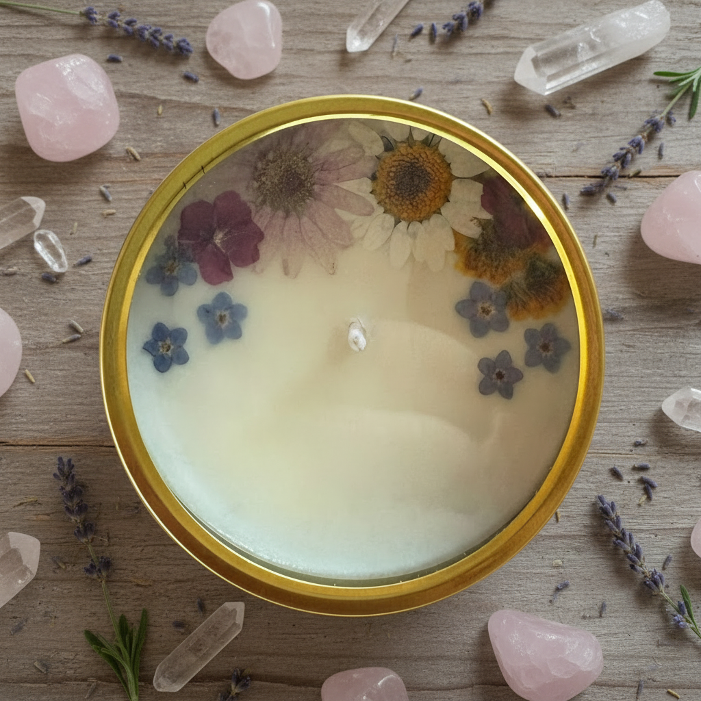 Hand poured 4 oz candle made with all natural clean burning ingredients and 100% soy wax. Some flowers will vary seasonally due to their organic nature, each one is unique. These candles come in a midnight blue gift box, topped with a metallic gold bow.